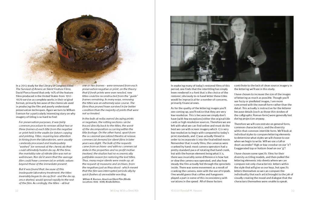 This original research is from the Vintage Styles section of a 5-part class series titled Writing with a Bent Nib. It is a study of the hand lettering of the Silent Movie era. It contains background, history and source documentation as well as an analysis of multiple examples of inter-title lettering.